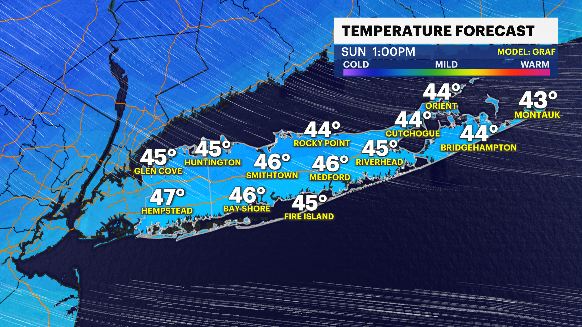 Temperatures in the upper 30s. A chance for rain showers next Sunday.