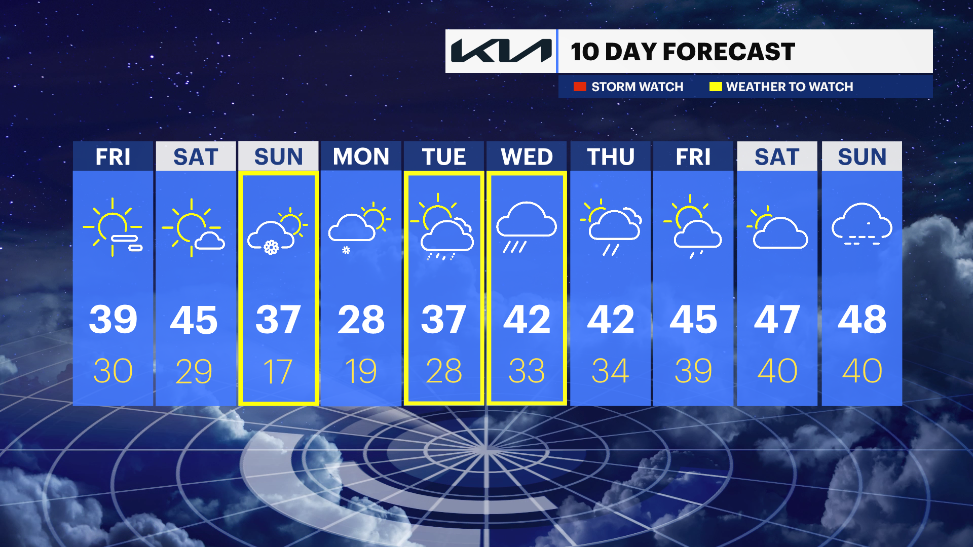 SATURDAY: Mostly sunny to partly cloudy. Highs around 44 degrees. Lows near 28 degrees.