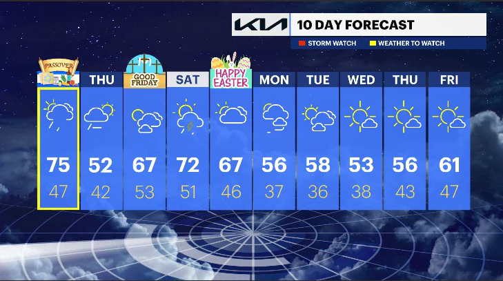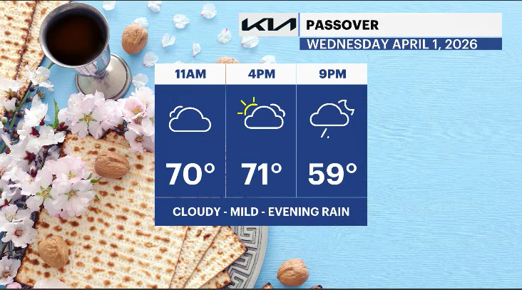 WEDNESDAY: PASSOVER (BEGINS AT SUNSET) - Mix of sun and clouds with warm temps. There is a chance of afternoon to evening thunderstorms. Highs: Mid-70s. Lows: Upper 40s.