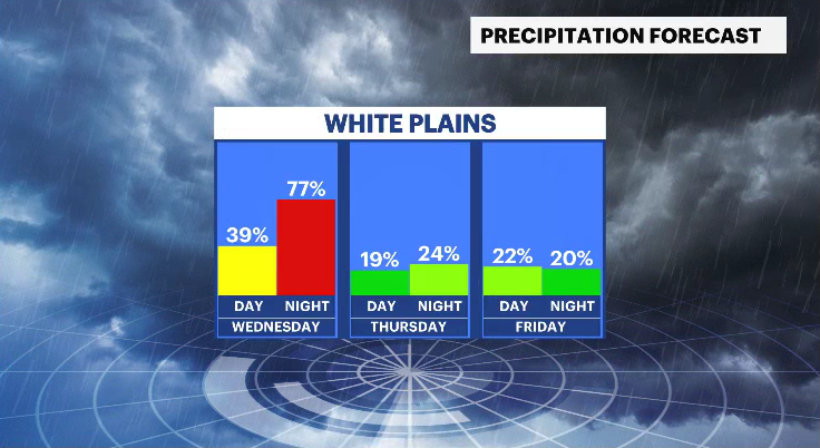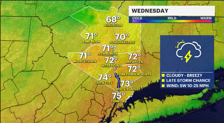 After already enjoying two consecutive days of mild to warm weather, the Lower Hudson Valley keeps the streak going Wednesday with an early summer feel. Highs will reach the low to mid‑70s under mostly cloudy skies. While much of the daytime should stay dry, a few showers or thunderstorms may develop during the afternoon, with a greater likelihood of storms Wednesday evening and overnight as a cold front moves through.