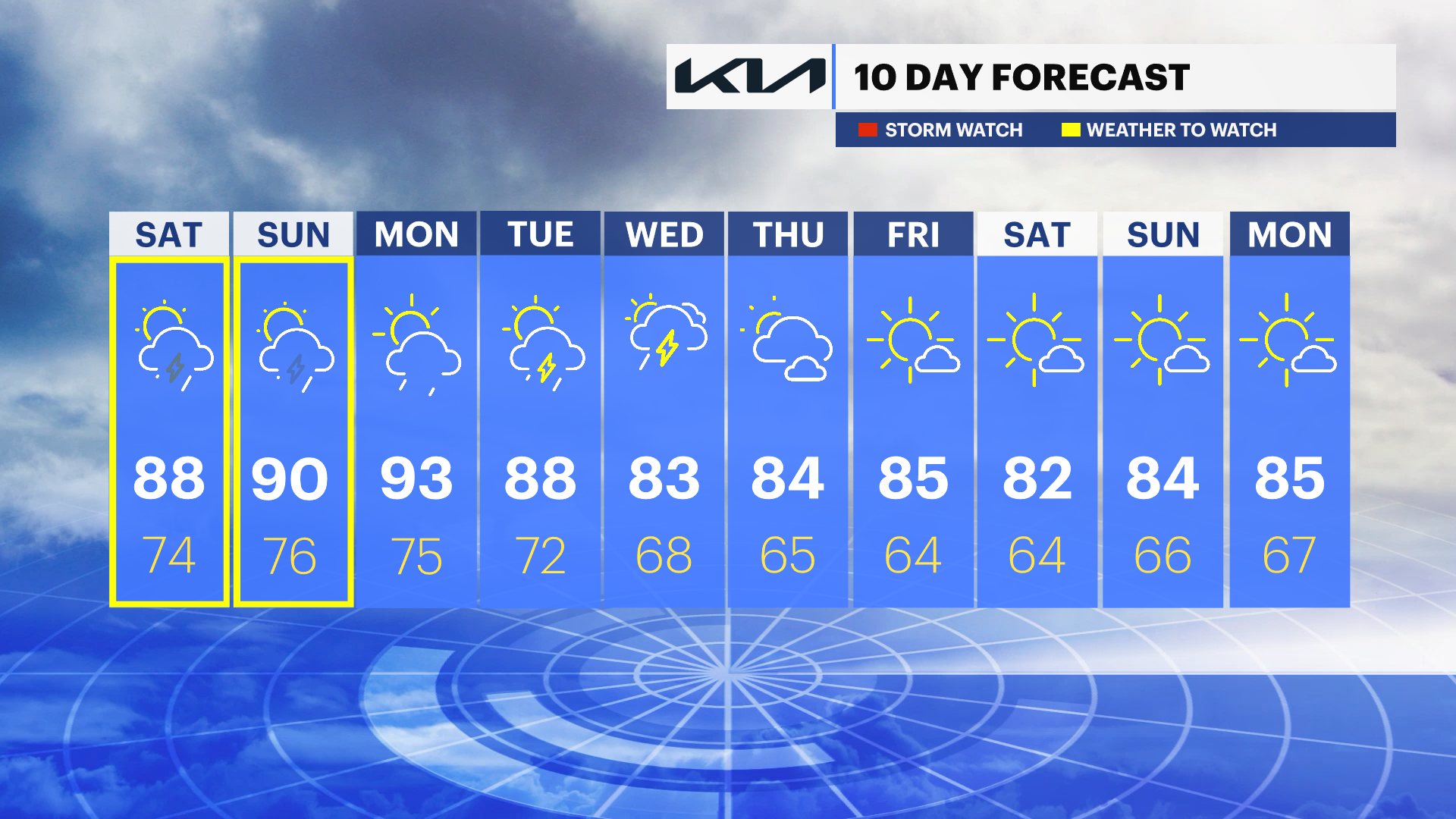 SUNDAY: Weather to Watch HEAT ALERT - Sun and clouds - chance for a spotty shower or storm. A few could produce heavy rain. Highs around 90. It can feel like near 100 degrees. Lows around 76.