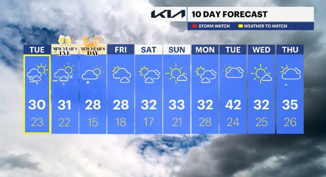 WEDNESDAY: NEW YEAR'S EVE - Mix of sun and clouds and windy at times. Highs: upper 20s to low 30s. Lows: upper 10s to low 20s.