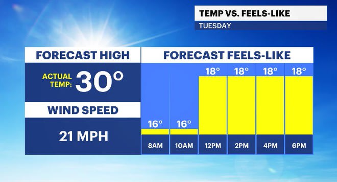 TONIGHT: Partly cloudy and windy (not as gusty as during the day) with temps feeling frigid. Lows: low to mid-20s.