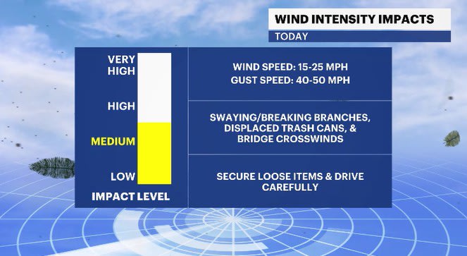 Expect sustained winds of 15-25 MPH with gusts around 45-50 MPH. Gusty winds will blow around unsecured objects (like holiday decorations). Tree limbs could also be blown down and a few power outages are possible.
