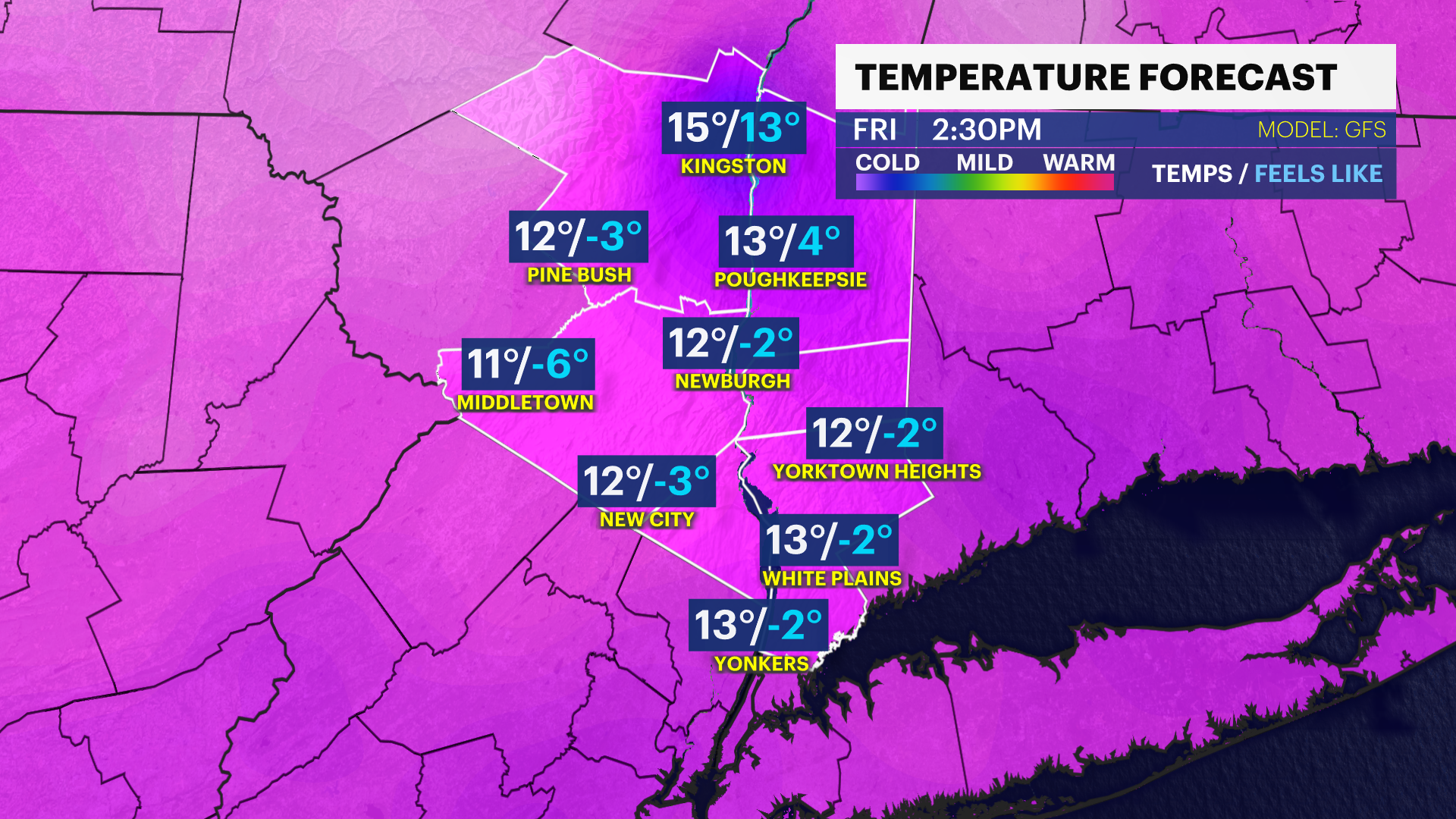 The coldest air moves in Friday afternoon into Saturday morning. We are forecasting a tie for the coldest January 30 high in Bridgeport (18 degrees). Overnight Friday, temperatures will drop to near zero degrees likely beating the record of 3 degrees.