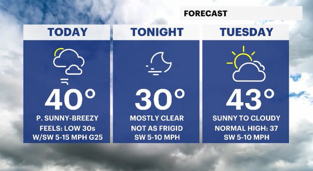 TODAY: Gusty winds are around in the morning with a lighter breeze for the afternoon. Temps will feel below average through the day. Highs: upper 30s to low 40s.